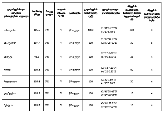 ზემოაღნიშნული გადამცემი სადგურის განთავსება შესაძლებელია მითითებული კოორდინატის მიმართ 500მ რადიუსის ფარგლებში, ზღვის დონიდან გადამცემი ანტენის დაკიდების სიმაღლის შენარჩუნებით (ცდომილება±5მ).