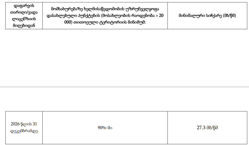 ე.ბ) უზრუნველყოს მობილურ/უსადენო ფართოზოლოვან მომსახურებაზე ხელმისაწვდომობა შემდეგ დასახლებულ პუნქტებში შემდეგი გრაფიკით (მომსახურებით დასაფარი ტერიტორია გეოგრაფიული (SHP) ფაილების სახით თან ერთვის. იხ. დანართი 4) თუ №6 აუქციონში გამარჯვებული პირი (მის სარგებლობაში არსებული ლიცენზიების გარეშე) გახდება 2600 მჰც სიხშირულ დიაპაზონში 10 მგჰ-ის მფლობელი