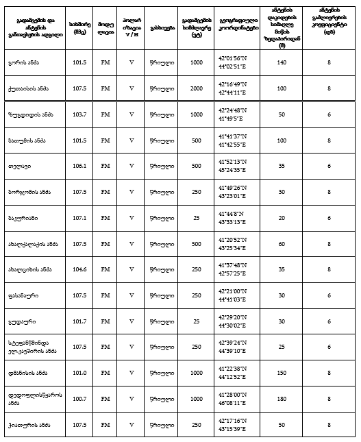 ზემოაღნიშნული გადამცემი სადგურების განთავსება შესაძლებელია მითითებული კოორდინატების მიმართ 500მ რადიუსის ფარგლებში, ზღვის დონიდან გადამცემი ანტენის დაკიდების სიმაღლის შენარჩუნებით (ცდომილება±5მ).